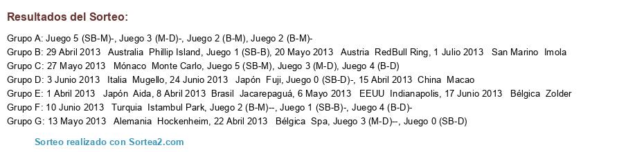 Lista de participantes: 1 Abril 2013 Japón Aida, 8 Abril 2013 Brasil Jacarepaguá, 15 Abril 2013 China Macao, 22 Abril 2013 Bélgica Spa, 29 Abril 2013 Australia Phillip Island, 6 Mayo 2013 EEUU Indianapolis, 13 Mayo 2013 Alemania Hockenheim, 20 Mayo 2013 Austria RedBull Ring, 27 Mayo 2013 Mónaco Monte Carlo, 3 Junio 2013 Italia Mugello, 10 Junio 2013 Turquia Istambul Park, 17 Junio 2013 Bélgica Zolder, 24 Junio 2013 Japón Fuji, 1 Julio 2013 San Marino Imola, Juego 0 (SB-D), Juego 0 (SB-D)-, Juego 1 (SB-B), Juego 1 (SB-B)-, Juego 2 (B-M), Juego 2 (B-M)-, Juego 2 (B-M)--, Juego 3 (M-D), Juego 3 (M-D)-, Juego 3 (M-D)--, Juego 4 (B-D), Juego 4 (B-D)-, Juego 5 (SB-M), Juego 5 (SB-M)-.