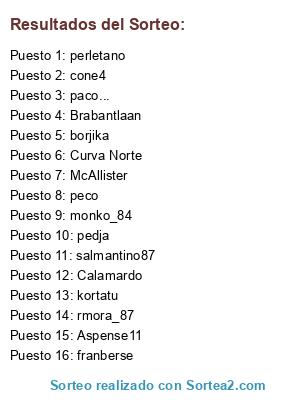 Lista de participantes: Brabantlaan, peco, Calamardo, franberse, cone4, pedja, rmora_87, Curva Norte, borjika, perletano, kortatu, monko_84, paco..., salmantino87, McAllister, Aspense11.