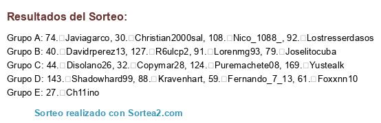 Lista de participantes: 1. Abrixa9, 2. Adrian2401, 3. Adrielsilva, 4. Adrinovoa94, 5. Agallego10, 6. Alejandrobm94, 7. Alesander_n, 8. Alexsanfer11, 9. Alexserra1612, 10. Alffoonso, 11. Andres2311, 12. Androide1014, 13. Anouar_sm, 14. anto-990, 15. Antonioga_1996, 16. Antoniojurado_20, 17. Atutitpleny, 18. Bellio44, 19. Benru82, 20. Blasco190, 21. Bysiito, 22. Caarliitoos15, 23. Canillejo, 24. Carlosxeles12345, 25. Carlotess90, 26. Catedral_5, 27. Ch11ino, 28. Cherchiracing, 29. Chevitha14, 30. Christian2000sal, 31. Contomatemelocom, 32. Copymar28, 33. Cortecero11, 34. Crisgijon_leon_2, 35. Crls_Sb, 36. Dani_the_reponei, 37. Danielo243689, 38. David_or5, 39. Davidcintas8, 40. Davidrperez13, 41. Davile07, 42. Delao1414, 43. Dionisd3, 44. Disolano26, 45. Dj_dani04, 46. Driwerone, 47. Edu7oro, 48. El_kaimo, 49. El_peki_10, 50. Elias-sfc10, 51. Eljozelu14, 52. Elpelodeunhuevo, 53. Eltiti96, 54. Eltito_javyto, 55. Elxeeric, 56. Enlove181, 57. Ericbland, 58. Evericmagnifico, 59. Fernando_7_13, 60. Fleki_96, 61. Foxxnn10, 62. Foxxtroxx, 63. Francisgranada19, 64. Frankinemenz6, 65. Gabi9989, 66. Gines1996vl, 67. Guillemlevante, 68. Guillesp_gsp, 69. Heti_69, 70. Huesito08, 71. Isestr20, 72. Ivanelcalvo, 73. Ivan-porreta, 74. Javiagarco, 75. Javiikmarzz, 76. Jdraven_1983, 77. Joriloire1, 78. Joseleuds, 79. Joselitocuba, 80. Josemod97, 81. Juanbartle55, 82. Juankar45, 83. Juanma_7rm, 84. Jvlm12, 85. Jzareth, 86. Karlako10, 87. Kevinvicky, 88. Kravenhart, 89. Letejr, 90. Loliyo4, 91. Lorenmg93, 92. Lostresserdasos, 93. Luismiguelboj, 94. M21061995, 95. Machotemct, 96. Maiik10, 97. Malaguenho1997, 98. Mariokingx, 99. Markitos44, 100. Marta7270, 101. Merengot, 102. Michipeple, 103. Micro, 104. Nacor-chamorro, 105. Naneras, 106. Narkeete, 107. Neoduke9, 108. Nico_1088_, 109. Noel_morenno, 110. Noquedaniuno, 111. Nyabihiman, 112. Pablobetico96, 113. Pablodbh, 114. Paulxx25, 115. Pekito69, 116. Percucion, 117. Pespi20, 118. Peteto10, 119. Piki9300, 120. Pixu, 121. Poky, 122. Pol10, 123. Poweyet, 124. Puremachete08, 125. Puxas, 126. Quinillo22, 127. R6ulcp2, 128. Raulito_!0, 129. Rayko666, 130. Revenge, 131. Robecai6, 132. Robex69, 133. Ruben_alex_7, 134. Rubioitsback, 135. Samuliyogarcia, 136. Sandrosamba, 137. Sanlesito_21, 138. Senaa24, 139. Sergiito9, 140. Sergiocarri, 141. Sergiosh93, 142. Sergiow96, 143. Shadowhard99, 144. Sogga, 145. Solozombis1, 146. Spctro, 147. St0onker, 148. Steffano0424, 149. Tete13guerra, 150. Thejoskiller, 151. Thezuleex, 152. Topito_williams, 153. Twirlyvix, 154. Ultra314, 155. Uri14casteller, 156. Urtzidj, 157. Use, 158. Valdi, 159. Vampraider, 160. Vsdeusdad, 161. Waliajr, 162. Walltrapa81, 163. Whitemire, 164. Wild2695, 165. Xou86, 166. Xxkaosblackxx, 167. Xxmiguelitoxx, 168. Yusta_riaza, 169. Yustealk, 170. Zxaavi18.