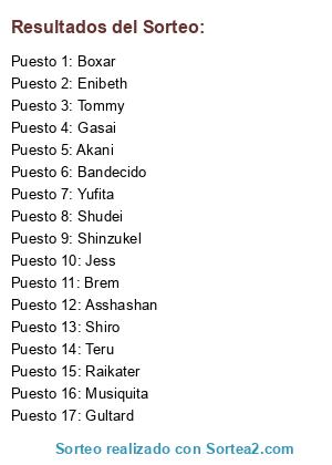 Lista de participantes: Enibeth (10 participaciones), Raikater (8 participaciones), Yufita (10 participaciones), Bandecido (10 participaciones), Musiquita (5 participaciones), Brem (10 participaciones), Shinzukel (3 participaciones), Shiro (10 participaciones), Gultard , Gasai (10 participaciones), Boxar (3 participaciones), Teru (2 participaciones), Tommy (10 participaciones), Akani (10 participaciones), Jess (10 participaciones), Asshashan (10 participaciones), Shudei (9 participaciones), Shudei.