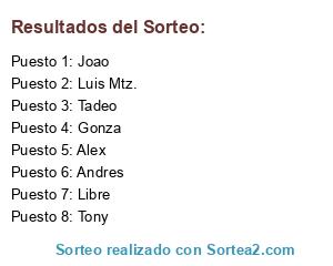 Lista de participantes: Libre, Tadeo, Gonza, Alex, Luis Mtz., Joao, Andres, Tony.