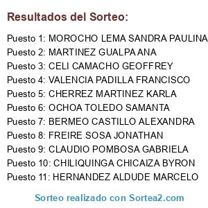 Lista de participantes: AYALA CASA CRISTIAN, BERMEO CASTILLO ALEXANDRA, CELI CAMACHO GEOFFREY, CERDA MOSCOSO ESTEFANY, CHERREZ MARTINEZ KARLA, CHILIQUINGA CHICAIZA BYRON, CLAUDIO POMBOSA GABRIELA, CRIOLLO ROMO GABRIELA, FREIRE SOSA JONATHAN, GUADALUPE SAETEROS DANIELA, HERNANDEZ ALDUDE MARCELO, MARTINEZ GUALPA ANA, MOROCHO LEMA SANDRA PAULINA, OCHOA TOLEDO SAMANTA, TOAPANTA BASANTES LUIS ARTURO, VALENCIA PADILLA FRANCISCO.