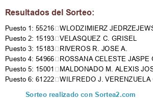 Lista de participantes: 12935 LA CRUZ C JOSE A, 13084 AVENDAÑO M TERESA DE J, 13129 OTERO J. DHUWYA A., 13204 SOCIO NUEVO, 13255 MEZA C. LUIS A., 13289 GALUE G. ABRAHAM DE JESUS, 13443 CABRERA P IVONNE, 13444 SANCHEZ JOSE A, 14356 GUILLERMO M. PERAZA, 14440 RODRIGUEZ PALACIOS MARIA DE L., 14513 CARLOS A. PEREZ S., 14515 PEREIRA S. IRMA C., 14624 THEN MAITA ROSA NATHALIE, 14636 CABRERA B. LIGIA E., 14649 GARCIA R. ADRIANA E., 14670 MANUEL EDUARDO DIAZ ACOSTA, 14682 ALBERTO JOSE QUINTERO, 14695 RODRIGUEZ B. SABRINA DEL VALLE, 14714 PACHECO A. LILIBETH, 14741 TREJO M. EDGAR A., 14742 RAMOS PE¥A MARIBEL, 14745 VASQUEZ S. SERGIO J., 14748 VARELA MARTINEZ JESIKA, 14754 PONTE H. MIREYA M., 14755 JULIO BARBA LANZ, 14797 ROSALES RAMIREZ ROMEL, 14814 YONEIRA F. SULBARAN G., 14828 DIAZ SOLANO DYLANA, 14837 NELSAIDA MARIA SANCHEZ RONDON, 14856 NAVARRO B. ANDREA C., 14865 FRANCESCA PAGANO GARCIA, 14867 EVA VICTORIA SALAZAR ALCALA, 14875 RUBER A. HIDALGO C., 14878 REINA MARGARITA GONTO MENDOZA, 14885 YHAMIRA A. RODRIGUEZ S., 14895 LEON L. EVELIN A., 14901 MARTIN O. ALINE C., 14917 ACOSTA B. GLENNY M., 14918 BENZO A. DIANA C., 14939 ALVAREZ P. ROSIBEL DEL CARMEN, 14945 PAUL JOSUE OLMOS, 14950 CHACIN A. ROYGARTH J., 14956 ROMERO B. CARMEN C., 14957 GARCIA L YUGDALIA, 14958 DIAZ M. DOMINGO U., 14960 MARTINEZ WILMER DE JESUS, 14963 BASTARDO S. RONALD L., 14967 ELBA DE LA LUZ GUERRERO R., 14969 DIAZ RAMOS ALBA, 14972 LOPEZ C. MAYRA A., 14973 CHACON O. RICARDO A., 14974 SOCORRO P. ORAIMAR M., 14975 GONZALEZ B. YAKORA Y., 14979 FARRO F. ENEIDA J., 14980 PACHECO N. TONY R., 14981 MENDEZ V. FRANKLIN E., 14985 ASCANIO AARON ENRIQUE, 14986 VASQUEZ C. YANETH E., 14987 ARTEAGA H. MARIA I., 14990 ALEJOS SARRIN PAOLA STEPHANIE, 14991 A¥EZ R. RAINIERO M., 14994 VALERO G. LORENA L., 14999 RIVAS H. ISSARLY DELMARY, 15001 MALDONADO M. ALEXIS JOSE, 15003 BERMUDEZ H. YESSICA R., 15004 GUEVARA P. DAMARYS V., 15006 PALACIOS GUTIERREZ JORDANA K, 15010 PERAZA S. ALEXANDER R., 15011 DELIDA C. CARRILLO, 15015 GONZALEZ E. ANA Y., 15018 PEREZ R. MARIAN A., 15025 CONTRERAS E. ADRIANA M., 15026 SUAREZ P. KAREN E., 15027 IBARRA GRAZZINA CARLOS HELI, 15031 QUINTANA N. YISBELY E., 15032 LOPEZ G. FLOR Y., 15033 MORENO V. MEIMALIN C., 15037 GONZALEZ D. JUAN CARLOS, 15039 FLORES C. JONATAN S., 15042 ROJAS R. GABRIELA I., 15043 VALLEJO V. MARIANA B., 15045 MARISELA DE AGRELA REVENTO, 15046 SOTO GIL DAMARYS A., 15047 OROPEZA RAMIREZ CLARIBEL, 15048 PAZ ZAMBRANO JHODELINS J., 15049 YOINA J. RIVAS S., 15052 VELASQUEZ V. ANA DEL VALLE, 15057 ADAME MARQUEZ INGRID CAROLINA, 15058 HALTY GALAZZO MARIA FERNANDA, 15059 MARTINEZ PAREDES ROISBEL, 15061 BLANCO PEREZ FRANK ELIEZER, 15063 KANZLER MUTTACH DANIELA, 15064 CARRE¥O BILLAUDOT RAFAEL D, 15065 CASTA¥EDA PEREIRA MIGUEL ANGEL, 15066 CHAVEZ PEREZ VALERY ALEXANDRA, 15067 LOPEZ CADENAS MARIA SONSIRE, 15068 INCIARTE VERGARA INGRID M, 15069 GONZALEZ P. JOSE M., 15070 MARISELA DEL VALLE BRAVO, 15073 CAMACHO QUINTANA JOSE MIGUEL, 15074 SALAZAR APOLINAR TARIANA J., 15075 HANDT DELGADO HELGA HELENA, 15084 RAMON CAPOTE, 15085 PEREZ HERNADEZ INGRIMAR, 15086 MADRIZ PEREZ MARXJORIE, 15088 YAGUAS MORALES KEILA ZULIMI, 15089 RANGEL RIVAS ARIADNA, 15090 PEREZ W. DANIEL A., 15091 GONZALEZ HIDALGO YORBIN JOSE, 15097 ANDRES D. SOLORZANO B., 15105 DABOIN PERNIA DULCINEA DEL V, 15107 PALMA C. SINAY A., 15108 GRANADILLO RAMIREZ JUAN CARLOS, 15111 TRUJILLO B. CELIA U., 15112 NOHELIA C. POLANCO O., 15113 DEIBIS E. COLORADO V., 15115 DIAZ P. ANAIS A., 15118 CAIRO A. HERNAN, 15123 PORTILLO C. EDGAR R., 15125 VERA V. JOAN R., 15126 FERRER A. GLADYS, 15127 MORA M. MARILU, 15128 IVIS MASSIEL POLANCO FARIAS, 15129 PEREZ V. MARCOS A., 15131 ARNAL G.LIBER R., 15132 CASTILLO M.CLEUSMARY, 15137 HERNANDEZ B. CESAR L., 15138 CUBILLAN C. LIZ NINOSKA, 15141 MENDEZ C. WUINDIMAR, 15142 GARCIA F. MARIA C., 15143 COLMENARES M. EDILIS D., 15144 CHIQUITO M. WILFREDO A., 15145 RODRIGUEZ C. JOSE GREGORIO, 15147 VARGUILLA A. RICHARD A., 15148 MEDINA CAMACHO YULEIMA DEL V., 15150 GUEVARA L. MADERLEINN Y., 15153 VAZQUEZ R. VICTOR R., 15154 MARTINEZ C. LOURDES M., 15155 ARRAIZ B. MAYDA C., 15156 PERDOMO G. MARYANGEL, 15157 QUINTERO T. JESSICA D., 15158 CEDE¥O L. MARIA E., 15159 OLIVERO Q. JIM JESUS, 15160 GUERRERO A. ADRIANA V., 15161 GONZALEZ H. GLEDDYS A., 15162 JIMENEZ O. FRANKLIN J., 15163 CHOURIO NEVIS ISIDRO, 15168 DUARTE V.DIANA C., 15172 MONTA¥EZ S. NARIALIS, 15173 NAVAS RODRIGUEZ EDUARDO, 15175 MORIAN OROPEZA YUNAIBA YERALD, 15176 VELOZO DELGADO PABLO, 15177 LANDINEZ CARMONA ELENITZA M., 15178 LLOVERA SANCHEZ LIGIA J., 15179 HUGLE ASCANIO SOLSIRE M, 15182 RIVAS R. ITCIANA N., 15183 RIVEROS R. JOSE A., 15184 JUAN M. NU¥EZ P., 15185 HAIDY COROMOTO ROJAS GIL, 15186 PE¥A KELLY VALERIE, 15187 RIVERO G. YESSIKA L., 15188 BRICE¥O E. LUIS A., 15193 VELASQUEZ C. GRISEL, 15194 YOKOY YAKENCY LEON G., 15198 ALMEIDA R.LUISA M., 15199 ANA Y. ANGARITA HERNANDEZ, 15202 WILMELIS CRISTINA PI¥A 07, 15203 BRENDA VERONICA CARRERO BERVIN, 15204 SOCIO NUEVO, 15207 BRICE¥O A.HEIDY DEL C., 15208 GONZALEZ J. NICOLAS R., 15210 ORAMA S.MARIA A., 15211 YADIRA MORIN ALAMO11, 15212 AVEIRO H. ADELIS A., 15215 ROSA NAILEHT GARCIA LEON, 15219 PATRICIA I. SOTELO E., 15220 JUNIOR T. LARREAL B., 15222 PAULINE A. ARRINDELL, 15223 DENISSE A. GUEVARA S., 15225 ANDREINA I. PEREZ M., 15227 MARCEL J.INOJOSA J., 15230 NANCY J. AGRINZONE S., 15231 MARCO LUIS SALCEDO TOVAR, 15232 ROBERT ANTONIO VARGAS LINARES, 15233 LURAYNI C. DIAZ CHACON, 15234 ANTONIO J. JEREZ D., 15235 TATIANA C. GONZALEZ R., 15242 CELENIA DEL CARMEN RAMIREZ A.0, 15243 DANLLYS K. GARCIA SIRA, 15244 MILEIRY K. QUINTANA H., 15245 KAREN G. DUARTE P., 15246 WILLMARY E. MORENO A., 15247 ROBER E. GONZALEZ C., 15251 JACKELINE J. HERNANDEZ E., 15253 WILLIAN J. ROMERO H., 15254 VANESSA L. LOZANO M., 15255 LILIAN J. CASTILLO S., 15257 SORENLIS DEL C. GONZALEZ Q., 15258 MARGREG CAROLINA GABALDON, 15259 YANIRETH J. JIMENEZ B., 15260 ADRIANA C. GONZALEZ, 15261 IVAN J.POLANCO, 15264 ROSANA C. FARRERA, 15265 JOSE A