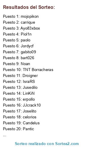 Lista de participantes: paolo, TNT Borracheras, Pantic, mojopikon, Sacro, bart026, Piol1n, celorios, JJcrack10, Ayo83xbox, rayykkonen, Jusedilo, carrique, LinKiN, gabito09, Jordycf, xtian33, erpollo, Jaimito, Joselito, Candelus, Malaguista4, IsraRS, Noan, Droigner.