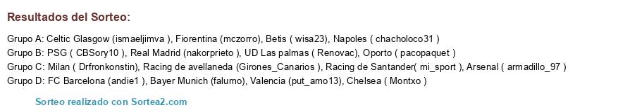 Lista de participantes: PSG ( CBSory10 ), Oporto ( pacopaquet ), Racing de Santander( mi_sport ), Bayer Munich (falumo), Napoles ( chacholoco31 ), Real Madrid (nakorprieto ), Racing de avellaneda (Girones_Canarios ), Fiorentina (mczorro), Milan ( Drfronkonstin), Celtic Glasgow (ismaeljimva ), Betis ( wisa23), UD Las palmas ( Renovac), Arsenal ( armadillo_97 ), FC Barcelona (andie1 ), Chelsea ( Montxo ), Valencia (put_amo13).