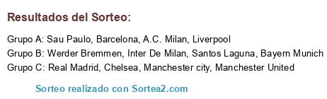 Lista de participantes: Manchester city, A.C. Milan, Real Madrid, Inter De Milan, Barcelona, Manchester United, Bayern Munich, Liverpool, Sau Paulo, Santos Laguna, Werder Bremmen, Chelsea.