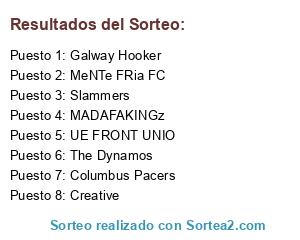 Lista de participantes: Columbus Pacers, MeNTe FRia FC, Galway Hooker, Creative, The Dynamos, Slammers, MADAFAKINGz, UE FRONT UNIO.