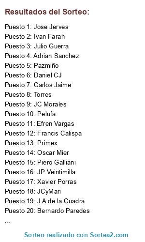 Lista de participantes: Torres, Pazmiño, Bernardo Paredes, Adrian Sanchez, Daniel CJ, Pelufa, Oracle, Anfer, Efren Vargas, Francis Calispa, Ivan Farah, J A de la Cuadra, JCyMari, Jose Jerves, JLPerez, JP Veintimilla, JC Morales, Maritn Baquero, Oscar Mier, Primex, Xavier Porras, Piero Galliani, Julio Guerra, Carlos Jaime.