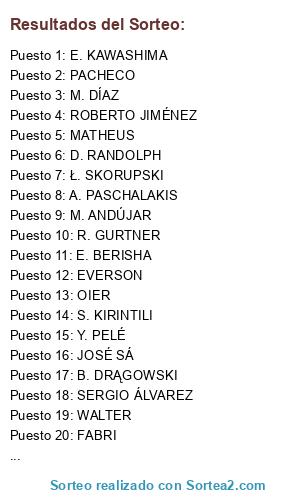 Lista de participantes: D. RANDOLPH, MATHEUS, Á. MONTERO, E. KAWASHIMA, K. CASTEELS, ROBERTO JIMÉNEZ, B. DRĄGOWSKI, JOSÉ SÁ, EVERSON, A. PASCHALAKIS, M. DÍAZ, PACHECO, Y. PELÉ, A. SHUNIN, SERGIO ÁLVAREZ, R. GURTNER, OIER, Ł. SKORUPSKI, E. BERISHA, RUBÉN BLANCO, M. ANDÚJAR, WALTER, S. KIRINTILI, A. CONSIGLI, I. RADU, FABRI.