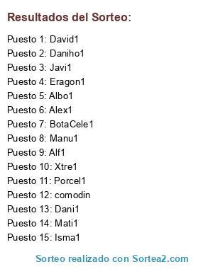 Lista de participantes: Porcel1, Mati1, Alex1, Alf1, Daniho1, Albo1, David1, Dani1, Manu1, Eragon1, Xtre1, Isma1, Javi1, BotaCele1, comodin.
