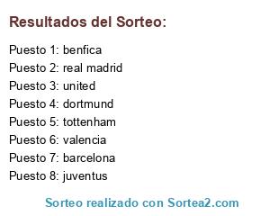 Lista de participantes: valencia, juventus, benfica, dortmund, real madrid, united, tottenham, barcelona.