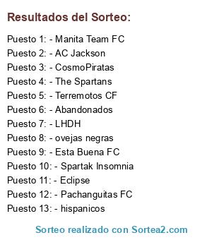 Lista de participantes: - Abandonados, - Spartak Insomnia, - Terremotos CF, - LHDH, - AC Jackson, - Pachanguitas FC, - The Spartans, - ovejas negras, - Manita Team FC, - hispanicos, - CosmoPiratas, - Esta Buena FC, - Eclipse.