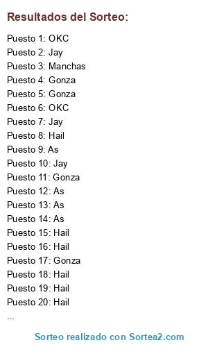 Lista de participantes: Hail, Hail, Hail, Hail, Hail, Hail, As, As, As, As, As, Gonza, Gonza, Gonza, Gonza, Jay, Jay, Jay, OKC, OKC, Manchas.