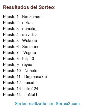 Lista de participantes: -JaNuLL, - Vegeta, -raicoht, -Seemann, -Wokooo, -Benzemen, -felipit0, -deividzz, -Dogmasakre, -Nenefer, -nencito_, -reyox, -siko124, -niklas.