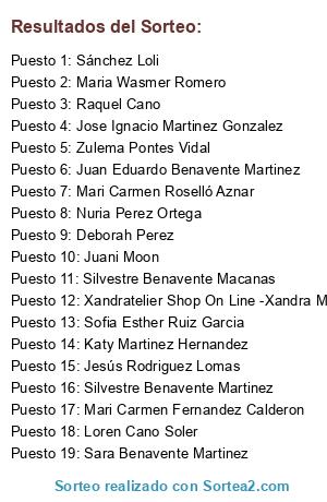 Lista de participantes: Nuria Perez Ortega(2 participaciones), Mari Carmen Roselló Aznar(4 participaciones), Sofia Esther Ruiz Garcia(2 participaciones), Sánchez Loli(9 participaciones), Jesús Rodriguez Lomas, Deborah Perez(2 participaciones), Loren Cano Soler(2 participaciones), Raquel Cano(3 participaciones), Katy Martinez Hernandez(2 participaciones), Juan Eduardo Benavente Martinez(2 participaciones), Sara Benavente Martinez(2 participaciones), Silvestre Benavente Martinez(2 participaciones), Xandratelier Shop On Line -Xandra Miguelez(3 participaciones), Jose Ignacio Martinez Gonzalez(4 participaciones), Maria Wasmer Romero(4 participaciones), Mari Carmen Fernandez Calderon, Silvestre Benavente Macanas(2 participaciones), Zulema Pontes Vidal(4 participaciones), Juani Moon(4 participaciones).