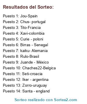 Lista de participantes: Rulo-Brasil, Tito-Francia, Jou-Spain, Chaches22-Belgica, Birras - Senegal, kaiku- Alemania, Chus- portugal, Iker - argentina, Santa - england, Curie - poloni, Xavi-colombia, Seti-croacia, Juande - México, Zorro-uruguay.