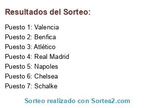 Lista de participantes: Napoles, Benfica, Real Madrid, Atlético, Schalke, Valencia, Chelsea.