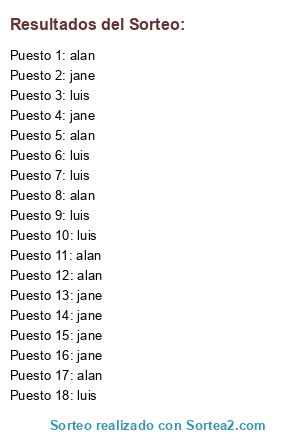 Lista de participantes: alan, alan, alan, alan, alan, alan, jane, jane, jane, jane, jane, jane, luis, luis, luis, luis, luis, luis.