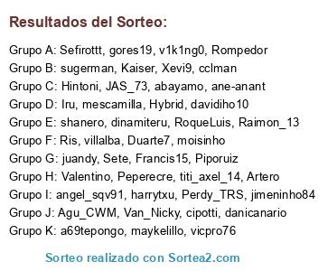 Lista de participantes: Sete, Van_Nicky, titi_axel_14, Perdy_TRS, Raimon_13, moisinho, danicanario, dinamiteru, cclman, Duarte7, Ris, Artero, Francis15, juandy, JAS_73, maykelillo, gores19, Xevi9, RoqueLuis, villalba, Hintoni, Piporuiz, Kaiser, Rompedor, harrytxu, Valentino, Hybrid, davidiho10, Agu_CWM, mescamilla, angel_sqv91, a69tepongo, cipotti, Iru, shanero, ane-anant, Peperecre, Sefirottt, v1k1ng0, sugerman, abayamo, jimeninho84, vicpro76.