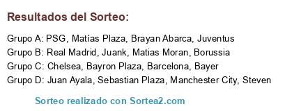 Lista de participantes: Real Madrid, Barcelona, Manchester City, PSG, Bayer, Borussia, Chelsea, Juventus, Juan Ayala, Bayron Plaza, Matías Plaza, Sebastian Plaza, Brayan Abarca, Juank, Matias Moran, Steven.