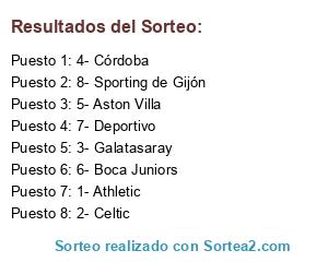 Lista de participantes: 1- Athletic, 2- Celtic, 3- Galatasaray, 4- Córdoba, 5- Aston Villa, 6- Boca Juniors, 7- Deportivo, 8- Sporting de Gijón.