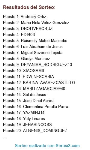 Lista de participantes: ANABELKISVALERA, ANA_VICIOSO_O, AMPAROSILVIA, ALEX_LOVE_07, YONEISYMARTINEZ, YOMARIS_NAILS, YERALIZADNUNEZ, YOMAIRAAXEL, YENNI201, YELIKA_LEBRON, YENNI_07, WANDIVICENTE, WILCRUZ1303, YADIRAMENA6, VDAWY, UHHICIANO, TWINSROQUEGARCIA, THEFLOWERCB, TONYLOPEZ2871, TEIPON_RD, TBURGOS687, SWEETCAKE_RD, SOSA_YAFREISY, SNOWVARGAS, RUTHCONTRERAS05, S.CUEVAS01, SABRINAMELENDEZH, RUDANNYFELIZ, RPEREZ45, RAQUELAQUEZADA, PICHIRILOSENOVIA, RAAA29, NICOLGE, NOELIAGS1920, OGANDO_SUERO, OREIVY, PALLEROROSANGEL, PASTORSIXTOGONZALEZ, PENGUZMAN, MAURICIOGUERRERO19, MCMENARIVAS, MCORPORAN07, MINELISDMARTE, MOISESMEJIABATISTA, MARYKAYJQM, MARLENY_3003, MARQUIRYML, MARGARET2904, MARIA_ROBLES_ABREU, MARIALESCASTILLO30, MARIOLISCARVAJAL, MARCOS_MENDEZ.01, LOURDESMARTINEZR, LYAGUZ, MANCEBOEVELYN, LA_MAS_DURA57, LACOQUETA.1529, LEONILDAMOREL, LIC.ALEJAND, LISSETTE.DELACRUZ.186, JREINOSO1, JUNIORHENRIQUE, KARINATAVAREZCASTILLO, KEILAYASYRYS, KIRSY_AGRAMONTE, JOELOLIVODP, JOSE.CORNELIO.7121, JOSEANGEL.RS, JEVENTOS_BY_JOFFY, ILONKA_ROMERO, INMOBISLA.ALU, ISANCHEZD10, ISAURA_LINARES, JAROCHA25, JASSEL13, JENNY_LIRIANO19, JEREMYSANCHEZ01, ESPERANZAMARCIA, ESTEFANYG.ROSARIOLORA, GEESEL_SOTO, GEISAPENA1, EMERSONLUCIANO23_, EMORILLO011, ENRIQUEMARIZAN, ESCARLINM22, DEYHANIRAP, DIAZARACELIS, DRAELAINELUBRANO, ECHO28SIERRA, ELBERTBODDEN, ELVAPESHOPRD, CLAUDIADEVEAUX, COQUETTISH_PRINCESS, CRISTIANRMP, CRISTINAMENDEZ05, DANIEL.MOYARODRIGUEZ, CHARILAJEFA, CIRCO_CANAS, CLARA83014, CLARARTE_ACCESORIOS_Y_MAS, CHARIBELVALLEJOOTANO, AROIDOALMANZAR1314, ASIS0720, AWILDTOLENT, BASTY_GOMEZ, BETSAIDA05, CAMINEROMIRIAM, CAROLIN.221, ANTHONY_1606_CUEVAS, ANYELINA2607, ARCENIOPINEDARUIZ, ARISVALDES, ANAMPAULINO17, ANDREMORILLO, ANGEL.ARIAS0926, AIDAYOKASTA, BILL_MARTINEZ01, EDWIN_NOVA01, JATNNALISSELOT, JDEARRUE, JINEIDYESPIRITU, NENALINDA_CON_SWAGUER, PRISCILA_N.25, SUGEY_BURGOS19, TEODISTA1, TIBURCIOMARQUIEL, URBAEZSAIRY, ARSENIOMELO, BRIDGITVASQUEZ, CORREACORREABRISEL, CRUZDEMESSINA, ELSHAMAKITOWSTH, ELTIOMUSIC, INDIANALMONTER, J.WIRFIN, JANEIRYSMONTERO, JHONELBHY, JOELVIS_SWAQQ, JOSERAFAELLOPEZPAULINO, KEILA_TAVERAS, LIC.BONILLA_19, LIC_CEPEDA, MARUORSINI7, ROSAELBAGONZALEZDURAN, WALEZA_GERMAN, YANIBELDELCARMEN, YUMAIRY31, ADONYSFERMIN, ALBA_PELER, ANGELRFMEJIA, ARISDELCARMEN.HIDALGOGUERRERO, DANIELAALBERTO, DUVERGE13, HDELOSSANTOS_98, JUANAGARCIA1606, LA_BETTY_12_, MART_LEIDY, MI_CHIQUI_Y_ALGO_MAS, MTORIBIO120, NIINA_RODG, RAYSSACE, RONALDGONZALEZ121, SABRINADUARTE_25, SAUL1305, SURANNYAM, TASIA_BELLAMY, _AWILDA_1257, AFCRHIS, ANGELA_MARIA0412, ANGELICASANTANAPEREZ, BIZZYBANDAA, DENYSE06, EDUARDO.0212, ELIANNYMICHELLDIAZ, ERIKAMREYES, JOSEPHTHOMAS0307, JS0.3, JUNIORRONDOR1207, KATERINPEREZCUEVAS, LEY04.LP, LUJOROM30, MARTINEZ_OLGALIDIA, RICHELL_NAIL, SYLBIRGUEZ, TERE.DLCRUZBELLA, ALBA.ESTHER, ARELISPEREZCORREA, ESTRELLA_DORADA00, GEORGE2607, JATNNACUETO, LA_ASHLEY_1, LISBETHTEANY, MEGAGELPY, OZEMA33, SFCL2, SHAILTERESA, SHERLINNATALI, TAPIA.92, THEGENERAL1892, THU_QUEEN0531, VINDAELENA, XXVANESSXX_, YEISON_FELIZ_PORTE, FEDESANTOS17, LYAH2024, HIJO_DE_DE_HASHEM, JAQUEZMARIANO, JONEL_GARCIA, JUAN_SENA13, KAT_ALVAREZ20, KENIABACOSTA, MARCOSCALDERON0021, MIMIVILCHEZ, PABLOMEDINA883, RICHARDCEPEDAD, ROXPHO, AIDA.SALTANA, ANYELAROSARIOLOPE, BUJIA03, COQUETA_NAILS_GAUDY, CORTORREAKEYLA, ANAROSELYSP, ESEQUIEL.ALEJO80, FAIRIS_14, IMLUZPAEZ, KATHERINE_D07, LIMARIA_01, lNESTAPIA, MEDINA.MARIBEL.7, NAITHCAPELLAN, YESSENIA.GONZALEZ.7965, CGC308, CHIKI1828, CHIKINAISL, CLARIBEL9314, CRISTOBAL.ENCARNACION.5, CYBERTECH2009, DIANAMARIACF, ELRANYEL14, ENGER_CARY, ERISONALMONTE, GENODISF, LA_JESSI2516, LOUISPIERREFIN, MASSIELTV, MERYOREILLY, NATHRIVERA15, PEOPLE__1515, RECV65, SBSTHIAGO, _SALDIVAR25, ALBA.NERIS, ALISHANICOLENIN, ANA_JUSTINA11, ANALIBIADURAN, PATRIABLANCO, Alba Meran, Alexandra Fernandez Camacho, Alexiis De Jesus Navarro, Adela Fernandez, Adris Thu Babi Jimenez, Rocio Vicente, Ruth Linares, Sandy Rafael Herrera Gomez, Sely Perdomo, Taty Garrido, theCalcoma Ramos Arias, Victor Hugo Castillo, Yamile Chaddy, Yerlin Caraballo, Yessenia Vilomar Ventura, Ysabel Valdez, Martin Bautista, Nilsa Rodriguez, Norelis Valdez, Nunca Zephir, Odalyska Reyes, Olga Roberts, Orlando Baez, Osirismonter Montero, Priscila Cruz Cabral, Quirsis Mojica, Raismely Mateo Mancebo, Reymundo Lorenzo Lorenzo, Reyna Basilio, Katiuska Perez, Kelvelin Rosario Vicioso A, Laura Massiel Geronimo, Liliana Garcia, Lolyn Cedeño, Lonny Smith Green, Luisyesennisflorianmendes Florian Mendes, Magdalena Martínez, Margarita Nuñez, Margarita Saoni Rodriguez, Marleny Castillo Trotman, Jessicascarlett Rodriguez Breton, Jesus Castillo, Jesus Miguel Cabrera, Jhamell Abreu, Jisela Brito, Jisset Brea, Jonathan Dpm, Josue Rodiguez Ramos, Juan Carlos Pache, Juan Pablo Mansevo, Kary Cruz Bueno, Esther Ramirez, Esther Valdez, Fairis Marcell R. Burgos, Felix Bencosme, Fernando Santana, Gisell Vasquez, Eliceo de la Rosa, Emil Gomez, Chelo Mejia, Clara Nuñez, Cristy Gonzalez, Dahiana Rosalia Vasquez Villanueva, Daysi Ozoria, Denis Mosquea Acosta, Dominga Ogando Lorenzo, Bellamy Santana De Jiménez, Bryán Hndz Dc, Carlos Jimenez, Carolina Suarez, Ana Luisa Suero, endriwscamilo, ENMANUEL1905, gabrielaybcc, gregori.toreto, joannarubi.gonzalez, keily6_, lamadamesantana, lm245357, lui.millones, LUISA.VENTURA19, mariaesperanzacampana, pastorh.lizardo, pedromonero, RAFFY0427, suryvallespaula, toribiomayerlin, yaplacencia, yshal4, yulip87, angel_daniel_hernandez15, carlos.encarnacion.vasquez, carmevale26, chisgarbelt, diaz_elisandra, iris.martinez1326, jeffry.jimenez, joelfcocruz, jorgematosc09, julio.ipda, lanecia1830, leoneidamendez, LORENAACEVEDOOLIVERO, massiel_olivero, reynosoisabel85, ruben_evangelista26, yeison_casanoba, _ceferinamarte8, _katherine81, carmencv04, el_sentimentalista20, FRANCISCOMESA04, indhiramoreli, j3anh, jacuza27, johannapolancohernandez, josefina5891, livanessaacosta, mariavirginia1126, marleny.luciano, maryalvarez1607, pedrorodriguezrd77, wendymejia,