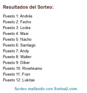 Lista de participantes: Lukitas, Fran, Santiago, Walter, Locke, Andrés, Díber, Facho, Riverteamo, Maxi, Nacho, Andy.