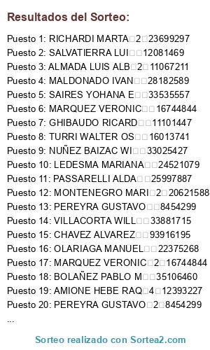 Lista de participantes: ALMADA LUIS ALB 11067211, ALMADA LUIS ALB 2 11067211, ALTAMIRA TERESI 16440720, ALTAMIRA TERESI 2 16440720, ALVAREZ ORLANDO 34371091, ALVAREZ ORLANDO 2 34371091, ALVAREZ SERGIO 23796541, ALVAREZ SERGIO 2 23796541, AMIONE HEBE RAQ 12393227, AMIONE HEBE RAQ 2 12393227, AMIONE HEBE RAQ 3 12393227, AMIONE HEBE RAQ 4 12393227, BARRIOS VICTOR 13949988, BEIRAS GABRIELA 21755928, BEIRAS GABRIELA 2 21755928, BEUCHER MARIA V 36030018, BOLAÑEZ PABLO M 35106460, BOLAÑEZ PABLO M 2 35106460, BRITOS FABIO 39073350, BRITOS FABIO 2 39073350, CAMPAL ADAN FRA 16652255, CAMPAL ADAN FRA 2 16652255, CARO ROXANA VER 29353078, CHAUQUE ERICA P 38413748, CHAUQUE ERICA P 2 38413748, CHAVEZ ALVAREZ 93916195, CHAVEZ ALVAREZ 2 93916195, CIUFFOLINI DIEG 28785591, CIUFFOLINI DIEG 2 28785591, CORREA ADRIANA 16508216, CORREA ADRIANA 2 16508216, DE LOS RIOS ANA 16229378, DUARTE NORBERTO 36679106, DUARTE NORBERTO 2 36679106, ENRRIQUE JULIA 32802911, ENRRIQUE JULIA 2 32802911, FREILLE RUTH ED 17183902, GASSIBE CARLOS 12187122, GASSIBE CARLOS 2 12187122, GAYTAN LEONARDO 31744896, GHIBAUDO RICARD 11101447, IDALGO MARIA RO 20916746, IDALGO MARIA RO 2 20916746, LEDESMA MARIANA 24521079, LEDESMA MARIANA 2 24521079, LENCINAS DEBORA 33006393, MALDONADO IVAN 28182589, MALDONADO IVAN 2 28182589, MARQUEZ VERONIC 16744844, MARQUEZ VERONIC 2 16744844, MARTINEZ MARIA 25759757, MOLINA DANTE EM 33701951, MONTENEGRO MARI 20621588, MONTENEGRO MARI 2 20621588, NUÑEZ BAIZAC WI 33025427, NUÑEZ BAIZAC WI 2 33025427, OLARIAGA MANUEL 22375268, OLARIAGA MANUEL 2 22375268, ORTEGA OSVALDO 21886069, OYOLA JUAN IGNA 32876005, OYOLA JUAN IGNA 2 32876005, PAJON LUCIANO T 41847295, PAJON LUCIANO T 2 41847295, PASSARELLI ALDA 25997887, PEREYRA GUSTAVO 8454299, PEREYRA GUSTAVO 2 8454299, PITTATORE MARIN 30766771, PONCE EMILIANO 30584297, PONCE HERNAN RO 28271592, PONCE HERNAN RO 2 28271592, REBAZA IPARRAGU 93521444, REBAZA IPARRAGU 2 93521444, REICHNBACHI ANA 21628881, REICHNBACHI ANA 2 21628881, RICHARDI MARTA 23699297, RICHARDI MARTA 2 23699297, ROCHA AGUSTIN A 39174301, RODRIGUEZ JOSE 12660000, RODRIGUEZ JOSE 2 12660000, ROMAN MIRIAM 18576878, SABADIA TAMARA 38987620, SABADIA TAMARA 2 38987620, SAIRES YOHANA E 33535557, SALVATIERRA LUI 12081469, SALVATIERRA LUI 2 12081469, SANTELLAN JARA 94226462, SANTELLAN JARA 2 94226462, SORELLO DARIO F 33515909, SUARES ROSA DEL 17277628, SUARES ROSA DEL 2 17277628, TAGLIERO FLAVIO 17189628, TEJEDA JONATHAN 32787026, TOMAS ANTONIO R 14660351, TOMAS ANTONIO R 2 14660351, TRONCOSO VICTOR 28225776, TRONCOSO VICTOR 2 28225776, TURRI WALTER OS 16013741, TURRI WALTER OS 2 16013741, URQUIZA MARIA B 24105550, URQUIZA MARIA B 2 24105550, VALLEJO JOSE RA 10417648, VALLEJO JOSE RA 2 10417648, VELASQUEZ RONAL 11868423, VELASQUEZ RONAL 2 11868423, VELAZQUEZ RAUL 17153162, VELAZQUEZ RAUL 2 17153162, VILLACORTA WILL 33881715.