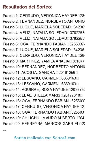 Lista de participantes: VALFRE, JORGE ALBERTO 24417895 (02302)69-2027, BRACAMONTE, IVAN EZEQUIEL 28605072 (03548)58-2115, SILVA, NELIDA DEL CARMEN 11188253 (0351)652-8889, BIEGO, LUCAS OSVALDO 34188419 (0351)284-3324, VACCARI, ALICIA DEL VALLE 14892573 (0351)477-0839, GIRAUDO, DANIEL EDUARDO 20532449 (0351)212-1426, STUTZ, EDGAR DAVID 38107777 (0351)214-7019, GIUSTO, GERMAN ALFREDO 13727465 (03541)57-2392, ARGÜELLO, IRENE PATRICIA 36629285 (0351)549-4615, SILVEIRA, AGUSTIN 31742725 (0351)660-3523, RODRIGUEZ, HONORIA 31904863 (0351)620-4717, ROLDAN, JUAN CARLOS 8567087 (0353)565-6547, CONDORI, ROSALIA 16682325 (0380)494-6744, JALID, YAMILA IVANA 28116772 (0351)786-4103, DIEZ, ANTONIO RICARDO 18395856 353-5634672, GRUMELLI, GERARDO ARIEL 32080634 (03533)45-8071, OGA, FERNANDO FABIAN 32550374 (03571)63-8343, VALDEZ, SANTIAGO ALEJANDRO 40681662 (0353)422-2530, PRUN, PABLO EZEQUIEL 28980946 (0353)656-1188, FERNANDEZ, NORBERTO ANTONIO 14428660 (03476)69-2576, VAEZ, LEONARDO NICOLAS 39057222 (0351)702-9025, JIMENEZ, ALBERTO JAVIER 8276732 (0351)349-8238, LOZANO TORTI, KARINA EUGENIA 25547643 (03541)53-4325, GUTIERREZ, RENE GUILLERMO 28852493 (0351)242-6665, CHIRMENA, GISELLE STEFANI 39691761 (0351)301-9790, CARNAGHI, LORENA BEATRIZ 28854340 (0351)742-8902, MO, NOELIA ELIZABETH 25829627 (0351)398-8646, ALTAMIRANO, NATALIA BELEN 37127825 (0358)548-4262, GODOY, ROBERTO EMANUEL 28821164 (0358)438-6109, PALACIOS, SILVIA ALEJANDRA 20700254 (0358)424-0705, GARAY, EZEQUIEL JOSE 29402379 (0358)412-0803, VELIZ, NATALIA SOLEDAD 37822539 (03564)44-0524, AMARA GAUTE, ALEJANDRO EMANUEL 35676277 (0358)431-7821, ZABALA, RICARDO SAMUEL 14666697 (0358)514-5714, ROSALES, MAURO ANIBAL 30436566 (011)5048-4184, CASSAN, MARISA ESTELA 17733849 (0358)411-3710, ARGüELLO, LUCIANA ROMINA 33320165 351-2869344, ROMERO, LAURA 25247925 (0351)513-3847, ROJAS, JUAN ALBERTO 13726910 (03537)30-0176, GUZMAN, NAHUEL ENZO 40419866 (0351)531-9436, COLAZO, CECILIA ELVIRA 16903309 (0351)654-5453, AGUIRRE, ROSA HAYDEE 20287502 (03546)45-5700, TORRESI, GABRIEL ANTONIO 17841686 (0351)453-1511, LEAL, STELLA MARIS 26177818 (03541)58-6641, PEREYRA, LUCILA MACARENA 38987436 (0351)279-1110, BRAVO, DIEGO ALEJANDRO 27173142 (0351)806-3991, OLIVA, FRANCO GABRIEL 32373269 351-3125023, LATANZI, LUIS MARIA 14552147 (03525)41-6584, GENESIO, MARIA ANDREA 20786964 351-5294399, LOPEZ, MARCOS SEBASTIAN 27079523 351-6150633, ZAPATA, SILVIA NELLY 14293165 351-7476795, BARRIOS, MARIA GLORIA 6258708 351-7567532, SUAREZ, FLORENCIA AGUSTINA 38105511 351-5945764, PERALTA, CRISTIAN EDGAR DAVID 27868993 351-6865196, CUEVAS, AGUSTIN JORGE 26181375 351-5052486, FARIAS, DANIEL LEONARDO 29136361 351-6803934, CARABAJAL, NORA YOLANDA 16014564 351-2398128, FUENTES, RAMON DARIO 17011631 351-3207298, VON POLHEIM, GERMAN MANUEL 14291939 351-5939618, ESCOBAr, BRAIAN ISAIAS 35982141 3571-607297, MERAVIGLIA, SANTIAGO SALVADOR 24386153 3571-523827, ALDAZORO, MARIO GUSTAVO 16838541 (03537)59-8079, LESCANO, CARMEN 6369163 (03472)50-7867, SALINAS, DELMIRIO DIONISIO 11231595 (03537)33-3903, GIAIMO, MARCELO WALTER 22371227 351-6193217, RUIZ, LAURA MARCELA 26744196 351-2039101, CABALLERO, DANIEL FERNANDO 20501352 3571-514317, AHUMADA, LEONEL CRISTHIAN 38331112 351-2589998, VINCEN, FRANCO DAMIAN 28273388 351-7061670, MOYANO, JORGE MARCELO 28348095 351-6009989, SANCHEZ, MARIA ANTONIA 5614747 351-4086587, ALBORNOZ, HUGO DANIEL 30658353 351-2961148, CORTEZ, VICENTE RAMON 13608316 351-3230703, CABRAL, RAUL EDUARDO 36432868 351-7137286, REPETTO, EMANUEL 29188667 351-3465543, GAETAN, CRISTINA SILVIA 14475109 351-6679589, FERNANDEZ, RUBEN ALBERTO 16408854 351-7381799, OCHOA, CARLOS ALBERTO 14901567 351-6837929, FARIAS, VALERIA SILVINA 35580231 351-2945848, CASTRO, OSCAR MAXIMILIANO 34234164 353-4092524, FUENTES, ARIEL EMILIO 29363476 351-5581111, CORIA, MARTIN FEDERICO 29029374 351-3261144, BRITO, DAMACIA MARILINA 26671302 3385-540881, ERSPARMER, MARIO MARCOS 28742500 351-6728603, KOWALCZUK, JUAN RAMON 35694627 351-8069209, CAMPOS, FABIAN RICARDO 32286161 (03537)59-2093, GONZALEZ, VICTOR HUGO 20074301 3575-403193, SARMIENTO, ILDA NOEMI 18374646 351-5481309, MONTOYA, SANTOS ANTONIO 11579159 3541-580211, LOTTER, IVANA MARIEL 27249393 3854-441974, ROMERO, CLAUDIA ALEJANDRA 27102305 351-7052099, BREGA CAVALLI, GABRIEL DARIO 24385609 351-3790506, MORAN, FANNY JULIETA 25457400 351-7648186, MONTOYA, ROQUE ALFREDO 14293340 351-5397947, MERCADO, ELIANA ANALIA 25582143 3541-560323, MONGES, FABRIZIO MATEO 42692263 351-2391972, ANDREOLA, LILIANA MERCEDES 11535797 (03537)68-0700, PERALTA, GABRIELA ANDREA 23161774 3537-680151, CARANDO, ANAHI DALILA DEL LUJAN 29411732 (0353)562-5056, VARRENTI, RICARDO ALFREDO 26078301 353-4147927, QUATRORDIO, LORENA BEATRIZ 23912379 3584-432956, COLAZO, JUAN RAMON 26411271 (0353)481-1064, POLLASTRINI, JORGE ALBERTO 12303779 (0358)430-3645, OCHOA, ROSA RAQUEL 20080098 358-4312446, EGUIAZABAL, DIEGO CARLOS 23709652 (0358)518-2263, ACOSTA, SANDRA 20181256 (0358)432-0138, JUAREZ, SILVIA ESTHER 13659728 (0358)484-8000, DUARTE, ALICIA INES 10566245 (03585)49-9875, GREEN, RODRIGO EMANUEL 35544674 (0358)482-3447, MORALES, CARLOS ALBERTO 13955535 (0358)507-0789, BULACIO, SABRINA NOELIA 35524515 351-8150537, CABALLERO, JONATHAN NAHUEL 36372435 353-4289551, ACOSTA, DIEGO SEBASTIAN 29475000 351-6957621, TABLADA, LUCIANO PATRICIO 26685318 351-3915366, CARIGNANO, LUIS ALBERTO 10648829 3541-552544, ORTIZ, CECILIA LILIANA 25072896 351-2490192, COSENTINO, DANIEL GUSTAVO 28127000 3541-577316, MACHUCA, LORENA DEL VALLE 30307295 351-3038168, FARIAS, FRANCISCO ARMANDO 16720978 351-3284429, TOLEDO, HORACIO ANIBAL 28430817 351-4240701, AMAYA, MATIAS EDUARDO 25608195 351-7055924, CERRUDO, VERONICA HAYDEE 28605072 (03537)33-9844, FERREYRA, MARCOS GABRIEL 23402687 (03402)52-7436, SANTOS MACIEL, RAMON 17079178 (0341)505-1484, RAMIREZ, JUAN HUMBERTO 13698748 (0358)506-6430, MAGALLANES, ELIAS 41878748 (0358)483-9794, MARTINEZ, YAMILA ANALIA 38107777 (03521)40-2527, SCAVARDA, CARLOS SERGIO 13727465 