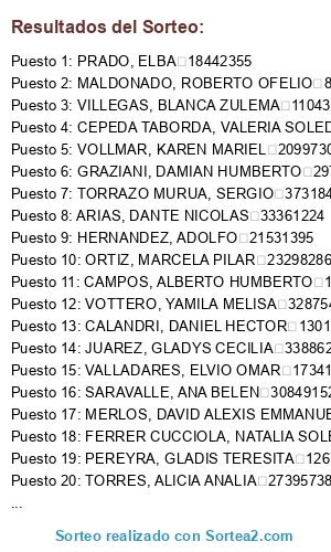 Lista de participantes: ABEL, PAULINA DEL VALLE 27921158 2, ABEL, PAULINA DEL VALLE 27921158, ACTIS, DELIA DEL CARMEN 6260601 2, ACTIS, DELIA DEL CARMEN 6260601, ALANIS, JUAN PABLO 17866864 2, ALANIS, JUAN PABLO 17866864, ALARCON, JULIO MARTIN 22049322 2, ALARCON, JULIO MARTIN 22049322, ALTAMIRANO, CARLOS OSCAR 24385466 2, ALTAMIRANO, CARLOS OSCAR 24385466, ALTAMIRANO, LUCAS MARTIN 30845486 2, ALTAMIRANO, LUCAS MARTIN 30845486, ALVAREZ, GASTON EXEQUIEL 41185362 2, ALVAREZ, GASTON EXEQUIEL 41185362, ALVAREZ, LAURA MABEL 13498530, ALVAREZ, MIGUEL MARTIN 30372556 2, ALVAREZ, MIGUEL MARTIN 30372556, AMAYA, ARIADNA ELIZABET 32591608 2, AMAYA, ARIADNA ELIZABET 32591608, ANASTASIA, JESSICA KAREN 40204754, ANDRADA, MAICO ARIEL 36845014, ANDRADA, MARIANA DEL CARMEN 22209315 2, ANDRADA, MARIANA DEL CARMEN 22209315, ARCOSTANZO, JESSICA GISELA DE LOS ANGELES 33320676 2, ARCOSTANZO, JESSICA GISELA DE LOS ANGELES 33320676, ARGUELLO, LUCAS DANIEL 40684612 2, ARGUELLO, LUCAS DANIEL 40684612, ARIAS, ALEJANDRO ALBERTO 16116806 2, ARIAS, ALEJANDRO ALBERTO 16116806, ARIAS, DANTE NICOLAS 33361224 2, ARIAS, DANTE NICOLAS 33361224, ARIAS,BLANCA VELINDA 12776037 2, ARIAS,BLANCA VELINDA 12776037, ARZE, GLADYS LEOCADIA 29712999 2, ARZE, GLADYS LEOCADIA 29712999, ASTRADA, CRISTIAN MARTIN 33832135 2, ASTRADA, CRISTIAN MARTIN 33832135, ASTUDILLO, CARLOS ADRIAN 23108417 2, ASTUDILLO, CARLOS ADRIAN 23108417, AUSTIN, ESTEFANIA ALEJANDRA 32604899 2, AUSTIN, ESTEFANIA ALEJANDRA 32604899, AVALOS, LEONARDO SEBASTIAN 40152830 2, AVALOS, LEONARDO SEBASTIAN 40152830, AVALOS, NOELIA VANESA 28065016, BAIGORRIA, MIRTHA EDITH 16282511 2, BAIGORRIA, MIRTHA EDITH 16282511, BARRERA, CECILIA NOEMI 32818352 2, BARRERA, CECILIA NOEMI 32818352, BAZAN, KARINA ESTRELLA 24173021 2, BAZAN, KARINA ESTRELLA 24173021, BENA, GABRIEL RICARDO 28833013 2, BENA, GABRIEL RICARDO 28833013, BENEDETTI BERGONZI, ELVIO ENRIQUE 11191103 2, BENEDETTI BERGONZI, ELVIO ENRIQUE 11191103, BERTONE CASIVA, MiCKAELA KARINA 36146863 2, BERTONE CASIVA, MiCKAELA KARINA 36146863, BOLSSICO, HUGO DANIEL 16554784, BONET, NORA BELEN 36196043 2, BONET, NORA BELEN 36196043, BOSSIO, SERGIO DANIEL 27018497 2, BOSSIO, SERGIO DANIEL 27018497, BROCCA, PABLO MARCELO 22567075 2, BROCCA, PABLO MARCELO 22567075, BUSTAMANTE, ELIANA SOLEDAD 36141833 2, BUSTAMANTE, ELIANA SOLEDAD 36141833, CABODEVILA, RODOLFO PEDRO 10408899 2, CABODEVILA, RODOLFO PEDRO 10408899, CALANDRI, DANIEL HECTOR 13010225 2, CALANDRI, DANIEL HECTOR 13010225, CAMPOS, ALBERTO HUMBERTO 14815487 2, CAMPOS, ALBERTO HUMBERTO 14815487, CAMPOS, JORGE ADALBERTO 29312725 2, CAMPOS, JORGE ADALBERTO 29312725, CANNIO, GONZALO GABRIEL 41033763 2, CANNIO, GONZALO GABRIEL 41033763, CARPIO, SERGIO LUIS 21858784 2, CARPIO, SERGIO LUIS 21858784, CARRANZA, SILVIA BEATRIZ 13268207 2, CARRANZA, SILVIA BEATRIZ 13268207, CASTRO, ELIANA ELIZABETH 34908770, CEBALLOS, MATIAS AGUSTIN 40681765, CEPEDA TABORDA, VALERIA SOLEDAD 27154846 2, CEPEDA TABORDA, VALERIA SOLEDAD 27154846, CHARRY OLMOS, RUBEN DARIO 95672768, CLEARY, EMANUEL ANDRES 25643827 2, CLEARY, EMANUEL ANDRES 25643827, CORZO, MARIA AGUSTINA 42384308, DADANO, SUSANA ELISABETH 21782977 2, DADANO, SUSANA ELISABETH 21782977, DAMIANI, MONICA SILVINA 21906946 2, DAMIANI, MONICA SILVINA 21906946, DELPINO, DOMINGO RAMON 18158484 2, DELPINO, DOMINGO RAMON 18158484, DIAZ MENDEZ, RUBEN DARIO 95852981 2, DIAZ MENDEZ, RUBEN DARIO 95852981, DIAZ, FABIAN ENRIQUE 23513199 2, DIAZ, FABIAN ENRIQUE 23513199, DIAZ, JESUS EDUARDO 14797484 2, DIAZ, JESUS EDUARDO 14797484, DIAZ, PAULA CECILIA 30195292 2, DIAZ, PAULA CECILIA 30195292, EMANUEL, RAUL OMAR 16634728 2, EMANUEL, RAUL OMAR 16634728, ESCALANTE, JENIFER JANET 39303647 2, ESCALANTE, JENIFER JANET 39303647, ESCOBAR, MIRIAM EDITH 21401370 2, ESCOBAR, MIRIAM EDITH 21401370, ESCOBARES, VALERIA ANDREA 27896610 2, ESCOBARES, VALERIA ANDREA 27896610, ESCUDERO, ROMINA MELINDA 29313161 2, ESCUDERO, ROMINA MELINDA 29313161, FALCO, ROMINA 32369488, FANTINI, PABLO FABIAN 33384913 2, FANTINI, PABLO FABIAN 33384913, FERNANDEZ CRAVERO, FEDERICO JESUS 30031699 2, FERNANDEZ CRAVERO, FEDERICO JESUS 30031699, FERNANDEZ, HUGO JAVIER 24526421 2, FERNANDEZ, HUGO JAVIER 24526421, FERRER CUCCIOLA, NATALIA SOLEDAD 29518737 2, FERRER CUCCIOLA, NATALIA SOLEDAD 29518737, FERRERO, DARIO EZEQUIEL 35544564, FIGUEREDO, MARTIN EZEQUIEL 26155604 2, FIGUEREDO, MARTIN EZEQUIEL 26155604, GACITUA, PATRICIA GRACIELA 18589902 2, GACITUA, PATRICIA GRACIELA 18589902, GARCIA, ANDREA MARIBEL 25151587 2, GARCIA, ANDREA MARIBEL 25151587, GARCIA, LUCIA MELINA 39072919, GARIBALDI, ALICIA RAQUEL 14292698 2, GARIBALDI, ALICIA RAQUEL 14292698, GARRONE, WALTER JOSE 14994062 2, GARRONE, WALTER JOSE 14994062, GEREZ, DAMARIS ALEJANDRA 40401135 2, GEREZ, DAMARIS ALEJANDRA 40401135, GIMENEZ, RAMON ADRIAN 24974204 2, GIMENEZ, RAMON ADRIAN 24974204, GODOY, LORENA SOLEDAD 25953380 2, GODOY, LORENA SOLEDAD 25953380, GOMEZ, MATIAS NICOLAS 39623071 2, GOMEZ, MATIAS NICOLAS 39623071, GONZALEZ LOPEZ, MARIA SILVANA 28345117 2, GONZALEZ LOPEZ, MARIA SILVANA 28345117, GONZALEZ, CLAUDIO JOSE 16947190 2, GONZALEZ, CLAUDIO JOSE 16947190, GONZALEZ, VIRGINIA MARIANA 30916917, GRAZIANI, DAMIAN HUMBERTO 29797966 2, GRAZIANI, DAMIAN HUMBERTO 29797966, GREEN, NANCY PATRICIA 17352326 2, GREEN, NANCY PATRICIA 17352326, GUZMAN, GUILLERMO ANTONIO 31947317 2, GUZMAN, GUILLERMO ANTONIO 31947317, HEINZMANN, HENRY ERICK 37134738 2, HEINZMANN, HENRY ERICK 37134738, HERNANDEZ, ADOLFO 21531395, HERRERA, NAIR 33701549 2, HERRERA, NAIR 33701549, ISOARDI, MAURICIO JOSE 32474871 2, ISOARDI, MAURICIO JOSE 32474871, JUAREZ, GLADYS CECILIA 33886232, KERMOL, RODRIGO LUCAS 26179425 2, KERMOL, RODRIGO LUCAS 26179425, LESCANO, ARIEL MAXIMILIANO 25344987 2, LESCANO, ARIEL MAXIMILIANO 25344987, LEYRIA, BEATRIZ MABEL 25236465 2, LEYRIA, BEATRIZ MABEL 25236465, LIGIOS BÄER, GEORGINA 34838988 2, LIGIOS BÄER, GEORGINA 34838988, LOPEZ, HERNAN RAMON 35715238, LORENTE, ITATI RAFAELA 27979112 2, LORENTE, ITATI RAFAELA 27979112, LOZA, CESAR MARTIN 266