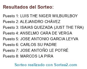 Lista de participantes: JOSE ANTONIO GARCIA LEYVA, ISAIAS QUEZADA (JUST THE TRA), ANSELMO CARA DE VERGA, CARLOS SU PADRE, MARCOS LA PIRA, LUIS THE NIGER WILBURLBOY, ALEJANDRO CHÁVEZ, JOSE ANTOÑO LE POTRÉ.