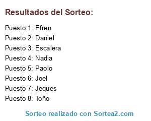 Lista de participantes: Escalera, Joel, Nadia, Daniel, Toño, Paolo, Jeques, Efren.