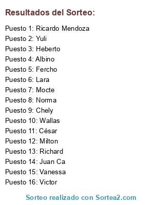 Lista de participantes: Albino, César, Chely, Fercho, Heberto, Juan Ca, Lara, Milton, Mocte, Norma, Ricardo Mendoza, Richard, Vanessa, Victor, Wallas, Yuli.
