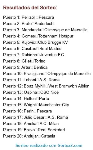 Lista de participantes: Casillas Real Madrid, Cech Chelsea, V. Valdés FC Barcelona, Hart Manchester City, Sirigu P.S.G, Lloris Tottenham Hotspur, Reina Liverpool, Abbiati A.C. Milan, De Sanctis S.S.C Napoli, Doni Liverpool, Viviano Fiorentina, Friedel Tottenham Hotspur, Mandanda Olimpyque de Marseille, Al Habsi Wigan, De Gea Manchester United, Gillet Torino, Landreau Lille, Ospina OSC Nice, Ruffier AS Sain-Etienne, Sorrentino Chievo Verona, Storari Juventus F.C., Szczesny Arsenal, Dida Portuguesa, Diego Alves Valencia, Given Aston Villa, Howard Everton, Krul Newcastle, Marchetti S.S. Lazio, Stekelenburg A.S. Roma, Amelia A.C. Milan, Babos N.E.C., Castellazzi Inter, Gomes Tottenham Hotspur, Mirante Parma F.C., Schwarzer Fulham, Andujar Catania, Aouate Mallorca, Brkic Udinese, Cudicini Tottenham Hotspur, Fabio Cruzeiro, Foster West Bromwich Albion, Helton Porto, Julio Cesar A.S. Roma, Lobont A.S. Roma, Muslera Galatasaray, Neto Fiorentina, Ochoa Ajaccio, Penneteau Valenciennes, S.Mingnolet Sunderland, S. Romero Sampdoria, Aranzubia Deportivo, Boaz Myhill West Bromwich Albion, Bracigliano Olimpyque de Marseille, C. Alvarez Espanyol, Carrol Olympiacos FC, Douchez P.S.G, Grégorini Nancy, Harper Newcastle, Javi Varas Celta De Vigo, Jääskeläinen West Ham United, Munúa Levante, Pellizoli Pescara, Perin Pescara, Proto Anderlecht, Roberto Zaragoza, Zaluska Celtic FC, Artur Benfica, Bizzarri S.S. Lazio, Boschker Twente, Carrizo S.S. Lazio, Cavalieri Fluminense FC, Costil Stade Rennais, Cros FC Sochaux, Fabianski Arsenal, Green Q.P.R, Jefferson Botafogo, Julio Cesar Benfica, Malafeev Zenit, Renan Internacional, Ricardo S.C. Olhanense, Rosati S.S.C Napoli, Rubinho Juventus F.C., Starke FC Bayern München, Toño Granada FC, A. Da Costa Sampdoria, Bravo Real Sociedad, Calatayud Mallorca, Cerny Q.P.R, E. Alvarado AZ, Gideao Nautico, Giovanni Atético Mineiro, Jorgacevic Club Brugge KV, Kelava NK Dinamo Zagrev, Kujovic Club Brugge KV, Leo Franco Zaragoza, Lupatelli Fiorentina, Megyeri Olympiacos FC, Michailov Twente, Mucha Everton, Padelli Udinese, Pantilimon Manchester City, Pavarini Parma F.C., Pinto FC Barcelona, Puggioni Chievo Verona, Vicente Guaita Valencia FC, Wright Manchester City.