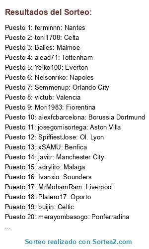 Lista de participantes: Adriantr127: Atco. de Madrid, adrylito: Malaga, alead71: Tottenham, alemalaga94: Bayern Munich, Alex1493: Hamburgo, alexfcbarcelona: Borussia Dortmund, AlexvsF1: Norwich City, AndrewTorres: Real Sociedad, Balles: Malmoe, benniscuba: As Roma, buijin: Celtic, CometHeaven79: Chelsea, cudeiro: Ath. Bilbao, Dakarri: B. Moenchegladbad, DaniBke: New York City, danygp89: Bournomounth, davidrikoone: Sp. Lisboa, El8Pelocho: Lugo, Ergion46: Monaco, ferminnn: Nantes, Goss83: Schalke 04, haankko888: Los Angeles Galaxy, HaLiToxGCFx: Granada, Havel7: Psg, iGosling v9: Arsenal, Ivanxio: Sounders, javitr: Manchester City, josegomisortega: Aston Villa, KaOs I AsTuR: Oviedo, lorenbb: Ol. Marsella, Luispro0103: River Plate, merayombasogo: Ponferradina, misterserpico: West Ham, Mori1983: Fiorentina, MrMohamRam: Liverpool, n0jan: Cristal Palace, NandoBel78: Real Madrid, Nelsonriko: Napoles, pececillo1977: Ajax, perikinho90: Cordoba, pinolines: Sevilla, Platero17: Oporto, Red Dutti: Bayer Leverkusen, Rokitys: Cska Moscu, Saavexbox: Las Palmas, Semmenup: Orlando City, sergiord14: Wolfsburgo, sergiotabascos89: Manchester United, SpiffiestJose: Ol. Lyon, SrPistolas86: Udinese, StormFury: Elche, susa16: Alaves, tabascos89: Barcelona, TATO XD: Depor, TheForceMaker: Alcorcon, toni1708: Celta, trunks: Levante, ulimoreno: Juventus, victub: Valencia, Viya88: Rayo Vallecano, x chachiquesi x: Betis, xSAMU: Benfica, Yelko100: Everton, zzzz jona zzzz: Boca.