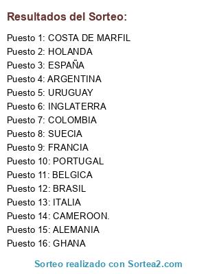 Lista de participantes: ESPAÑA, FRANCIA, ITALIA, INGLATERRA, ALEMANIA, BRASIL, ARGENTINA, URUGUAY, COLOMBIA, HOLANDA, COSTA DE MARFIL, PORTUGAL, BELGICA, SUECIA, GHANA, CAMEROON..