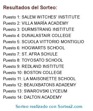 Lista de participantes: DUNALASTAIR COLLEGE, HOGWARTS SCHOOL, BEAUXBATONS ADADEMY, DURMSTRANG INSTITUTE, VILLA MARÍA ACADEMY, BOSTON COLLEGE, LA MAISONETTE SCHOOL, REDLAND INSTITUTE, SCUOLA VITTORIO MONTIGLIO, SALEM WITCHES' INSTITUTE, SWAROVSKI LYCEUM, TOYOSATO SCHOOL, ST. AFRA SCHULE, DALTON ACADEMY.