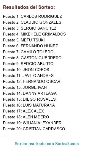 Lista de participantes: FERNANDO NUÑEZ, MIKEHELE GRIMALDOS, FEDERICO NUÑEZ, JHON COBOS, LUIS MATURANA, METU TSUKI, FERNANDO OSCAR, SERGIO ABURTO, GLOBO OSCAR, JAVITO ANDRES, DJAHM ADN, JORGE IVAN, SERGIO SANCHEZ, GASTON GUERRERO, DANNY ARTEAGA, CLAUDIO GONZALES, DIEGO ROSALES, CAMILO TOLEDO, GUILLE HERRERA, CRISTIAN CARRASCO, VICTOR OLMOS, CARLOS RODRIGUEZ, WILIAN ALEXANDER, ALEN MDERO, ALEX ALEX.