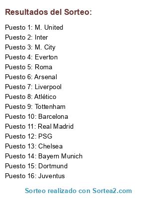 Lista de participantes: Everton, Real Madrid, Dortmund, Roma, Tottenham, Barcelona, M. United, Inter, M. City, Liverpool, Chelsea, PSG, Atlético, Juventus, Bayern Munich, Arsenal.