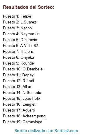 Lista de participantes: H.Lloris, Dmitrovic, Kounde, Lenglet, Nacho, N.Semedo, Felipe, R.Lodi, Allan, Onyeka, Camavinga, A.Vidal 82, Neymar Jr, O.Dembele, Depay, Agüero, L.Suarez, Acheampong, Joao Felix.