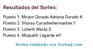 Lista de participantes: Sharay Cyrusbiebermaslow 1, Miriam Dorado Adriana Dorado 4, Veronica Marleen Ü 2, Maria Valentina Pargas Pacheco 3, Angelica Bua Velez el 1, Lizbeth Meráz 2, Milagros Puly Martiradonna 1, Miiqaahh Lagarde el1, Ailèn Hardt El 1, NiicThee RoozaaLeez 3, Danyeela' Sànchez 3, Princezitha Valencia Diaz 1, Miriam Dorado Adriana Dorado 1, Sofi Bustos 1, Norma Araujo Infante 1.