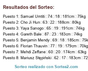 Lista de participantes: Jack Butland 72 19 192cm 95kg, Daniel Carvajal 77 21 173cm 73kg, Kurt Zouma 74 17 190cm 87kg, Samuel Umtiti 74 18 181cm 75kg, Lucas Digne 75 19 178cm 74kg, Geoffrey Kondogbia 76 19 188cm 80kg, Moussa Sissoko 76 23 187cm 83kg, Paul Pogba 81 19 188cm 80kg, Florian Thauvin 77 19 179cm 70kg, Jesé Rodriguez 76 19 178cm 73kg, Gareth Bale 87 23 183cm 74kg, Min Sang Gi 60 21 184cm 79kg, Mehdi Zeffane 60 20 174cm 63kg, Benjamin Mendy 69 18 185cm 75kg, Carlos Casemiro 77 20 184cm 80kg, Christophe Bahebeck 68 19 182cm 76kg, Anthony Martial 63 16 181cm 76kg, Yassine Benzia 66 17 179cm 71kg, Julian Jeanvier 56 19 182cm 73kg, Kwak Kwang Sun 65 26 186cm 76kg, Cho Ji Hun 63 22 188cm 80kg, Mariusz Stępiński 62 17 183cm 72kg, Yaya Sanogo 65 19 191cm 74kg.
