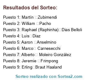 Lista de participantes: Pedro Porro, Luis Diaz, Marcin Bułka, Martín Zubimendi, Benjamin Sesko, CRYSENCIO SUMMERVILLE, PIETRO HINCAPIÉ, Aaron Anselmino, Jeremie Frimpong, Raphael (Raphinha) Dias Belloli, Jose Luís (Pepelu) García Vayá, Erling Braut Haaland, ANTONIO JOAO TAVARES SILVA, Marco Carnesecchi, RONALD ARAUJO, Alphonso Davies, Takefusa Kubo, JUDE BELLINGHAM, William Pacho, Thiago Almada, Florian Wirtz, Rasmus Højlund, Alan Gonzalo Varela, Franco Mastantuono, Alberto Moleiro González.