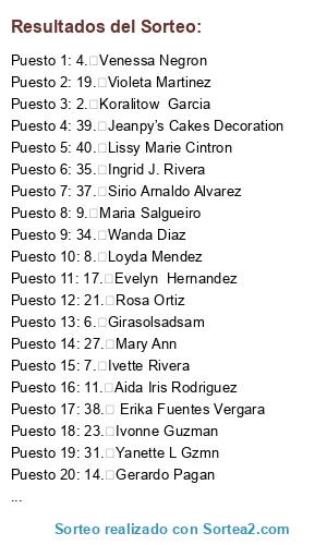 Lista de participantes: 1. Dindy Perez, 2. Koralitow Garcia, 3. Wally Camacho, 4. Venessa Negron, 5. Sheila Lopez, 6. Girasolsadsam, 7. Ivette Rivera, 8. Loyda Mendez, 9. Maria Salgueiro, 10. Marilyn Nieves, 11. Aida Iris Rodriguez, 12. Iris Garcia, 13. Patricia Romero de Mayorga, 14. Gerardo Pagan, 15. Jeamed Sierra, 16. Soqui Rodriguez, 17. Evelyn Hernandez, 18. Tete Reyes, 19. Violeta Martinez, 20. Gladys Torres, 21. Rosa Ortiz, 22. Franceline Gonzalez, 23. Ivonne Guzman, 24. Luchin Alverio, 25. Karen Soberal, 26. Bimary Cruz, 27. Mary Ann, 28. Maritza Scionbabygirl, 29. Maritsa Djeus, 30. Andy Senatus Jean, 31. Yanette L Gzmn, 32. Elisa Ramos, 33. Iris Llera Rivera, 34. Wanda Diaz, 35. Ingrid J. Rivera, 36. Lourdes Grisell Garcia, 37. Sirio Arnaldo Alvarez, 38. Erika Fuentes Vergara, 39. Jeanpy’s Cakes Decoration, 40. Lissy Marie Cintron.