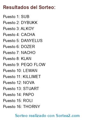 Lista de participantes: PAPO, DANYELUS, DOZER, NACHO, DYBUKK, CACHA, KLAN, LEWAN, ALKOY, KILLIMET, PEQO FLOW, NOVA, SUB, ROLI, STUART, THORNY.