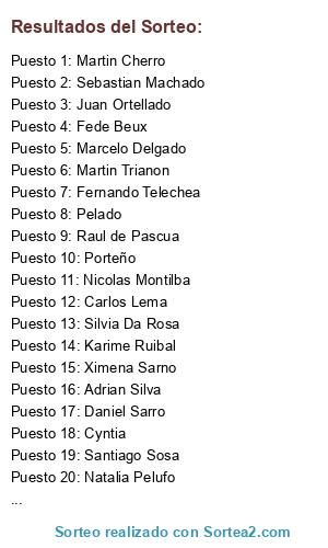 Lista de participantes: Fede Beux, Juancito Iroz, Claudio Martinez, Fernando Llovet, Esteban Hourcade, Laura Rodriguez, Fernando Telechea, Ignacio Fridman, Horacio Nemeth, Carlos Lema, Santiago Perez, Roxana, Diego Rosselli, Roger, Monica, Martin Trianon, Marcela, Elena, Romi, Moriana, Leonardo B, Fabricio, Maxi, Maidana, Anibal, Sebastian Machado, Martin Cherro, Raul de Pascua, Marcelo Delgado, Nicolas Pence, Juan Ortellado, Guille, Rosvelt, Pelado, Cyntia, Joaquin, Latorre, Maccio, Ailin, Ana, Porteño, Marce Saje, Federico, Adrian Silva, Bibi C, Ximena Sarno, Natalia Pelufo, Karime Ruibal, Nicolas Bianchi, Daniel Sarro, Patricia Totorica, Silvia Da Rosa, Matias Senas, Santiago Sosa, Nicolas Montilba.