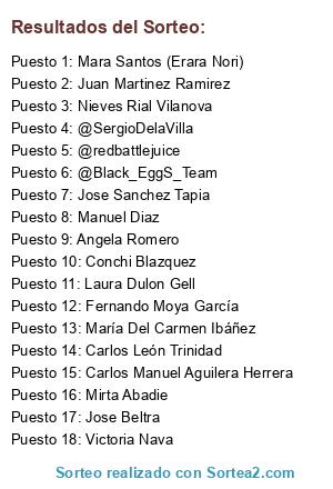 Lista de participantes: Oscar Gomez Pimentel, Ana Valle Rozalen, Nieves Rial Vilanova, Jose Antonio Gonzalez Fernandez , Jose Agrispin Troche Gonzalez , Josefa Peregrina Morales , Juan López, Javier Beltran Carceller, Victoriana Barrera Barba, Sergio Uceda Blazquez, Conchi Blazquez, Beatriz Lastra, Juan Martinez Ramirez , Sergio Garcia, Sergio de la Villa, Juan Manuel Dominguez Romero , Lmc Pascual, Esperanza Marin Marin, Eva Maria, Javier De Mingo Rodriguez, Carmen Lucia Martin , Francisco Serrano Vera , Miguel Perez Martin, Maricarmen Pina Esteve, Gregorio Arevalo, Gema VG, Benjamin Pérez López, Florentina Ghinet, Loli Ruiz Martinez , Fina Alarcon Belando, Carmen Cabrera Martin , Inmaculada Martinez Diz, A. E. , Jose M Perez Manteiga , Ricardo Diaz, Manuel Diaz, Mirta Abadie, Noelia Nuñez Lara, Miguel Fernandez, Genoveva Hernandez Guijeño, Manolo Peña , Carlos Manuel Aguilera Herrera, Manuel Castro García, Loli Fernandez Marcos, Arturo Echavarria, Rosa Vidal Cano, Ariadna Carreño Santana, Fernando Moya García, Conchi Tuero Alvarez, Pau Garcia Julia, Alfredo Fortea Velasco, Kimg Martinez, Eladino Crespo Martinez, Aitana Leon Ruiz , Angeles López, Karol Rodriguez, Jose Reiriz Perez , Carmen Peña Rodriguez, Brahms González, Aquilino Robles Garcia, Abraham Gonzalez Contreras, Domingo Garrido Mansilla, Maria Sonia Molpeceres Blazquez, Jose Beltra , Antoni Aguiló, Rita Bolaños Polegre, Victor Manuel Dos Santos Cordeiro, Jose Antonio Garcia Morales, Maria De Gador Crespo, Jose Wilmar Angulo Bermudez, Rafael Enguidanos, Enrique Campos, Marin Frangulea, Javier Bastidas Portillo , Javier Couso Cardenas, Tudor Marincea, Kamal Sev, Víctor Hernández Quintero, Pilar Aranda, Ernesto Tormos Martinez, Ramon Juradoruiz, Felipe Fernandez, Martín Jiménez Marín, Francisco Perez Perez, Gaspar Suarez Piñera, Isabel Hernandez Valiente, Guillermo Hernan Cascante Leon, Joan Salvany, Sandra Company Sureda, Gemma Sanz Lopez, Yliana Gomez, José Maria Pere Blanco, Sakhawat Hussain, Federico Olmo Serrano, Rosi Solas Serrano, Juan Cerezo Carrasco, Manuel Perez Herrada, Rafael Lucena Rambla, JM Martin Santos, Filomena Arroyo Cardona, Antonio Gonzalez Cañadas, Maricarmen Suárez, Jose Galan Fernandez, Angela Romero, Jordi Teide, Conchi Saez Cuesta, Dolores Amador Moreno, Jose Sanchez Tapia, Luis Aldana Bescos, Cristina Hernandez, Maria Jose Ramirez Carmona, Mercedes Muñoz, María Del Carmen Ibáñez, Fernando González, Maikel Botana, Isbelt Gell Aboy, Martin Valverde, Maria Carmen Gil Patiño, Diego Caballero Martinez, Enrique Conejero Verdu, Blanca Salmeron Fernandez, Marinilla Toledo, Victoria Nava, Laura Dulon Gell, Ana Belén García Luque, Carmen Torromé Donate, Caridad Perez, Josefina Valdivia Orihuela, Jose Aranda, Flora Espinosa Sanchez, Nina Claribel Son, Carlos León Trinidad, Lluca Montero, Mara Santos (Erara Nori), Mer Chita, Jose Antonio Perez, Carolina Mahía, @manel_ds, @byz4byz, @lasciateognespe, @FTIrene, @Juan_LoMa, @Cosasdejovene11, @morenoapa, @fcolm , @javierbc67, @Colmicsev, @SergioDelaVilla, @Belenp, @vbb_es, @vacacionesue, @ssgkrks, @titotitomadrid, @NArranz, @superluis, @supermerced, @marconinet, @toupaipai1979, @AzucenaGallard, @yeiko80, @colmicsev, @Angeles48650862, @joselillorm, @zOmiCrew, @SPiscinero, @Black_EggS_Team, @Gamosa1958Jorge, @yeravrs, @Marxosa16, @secosoma, @nva_victoria, @rebecaruiz15, @redbattlejuice, @melesal.
