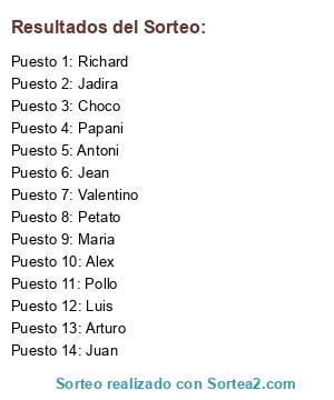 Lista de participantes: Alex, Choco, Petato, Jadira, Arturo, Richard, Valentino, Juan, Papani, Pollo, Antoni, Jean, Luis, Maria.