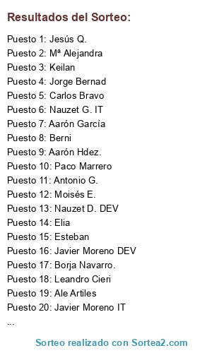 Lista de participantes: Adrián Ramos, Otoniel P., Aarón Hdez., Borja Navarro., Nauzet G. IT, Nauzet D. DEV, Paco Marrero, Aarón García, Jorge Bernad, Elia, Ale Artiles, Leandro Cieri, Javier Moreno DEV, Javier Moreno IT, Eudelio, Antonio G., Borja Suárez, Berni, Moisés E., Mª Alejandra, Carlos Bravo, Jesús Q., Esteban, Miguel Herrera, Keilan.