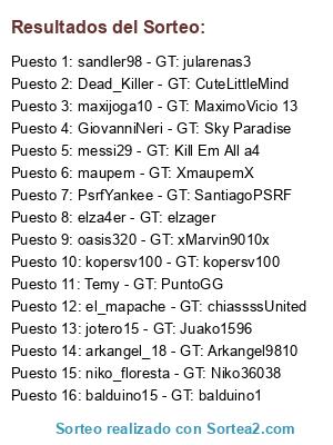 Lista de participantes: kopersv100 - GT: kopersv100, niko_floresta - GT: Niko36038, maupem - GT: XmaupemX, messi29 - GT: Kill Em All a4, PsrfYankee - GT: SantiagoPSRF, Dead_Killer - GT: CuteLittleMind, jotero15 - GT: Juako1596, sandler98 - GT: jularenas3, balduino15 - GT: balduino1, elza4er - GT: elzager, arkangel_18 - GT: Arkangel9810, GiovanniNeri - GT: Sky Paradise, el_mapache - GT: chiassssUnited, Temy - GT: PuntoGG, maxijoga10 - GT: MaximoVicio 13, oasis320 - GT: xMarvin9010x.